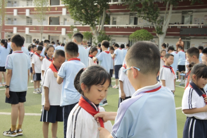 当老队员为新队员戴上红领巾时,那一张张灿烂的笑脸映衬着鲜艳的红领巾,显得格外耀眼。这是属于他们的光荣时刻,也是他们成长道路上的重要里程碑。