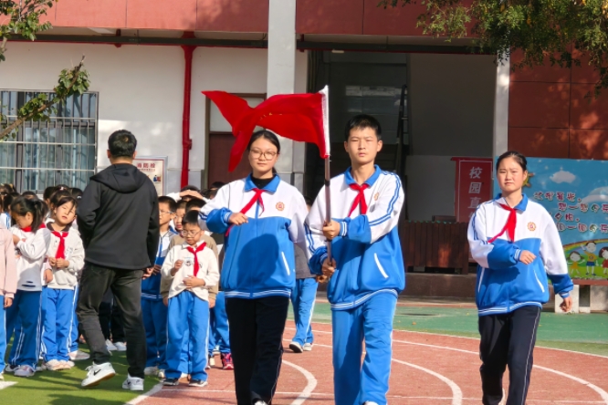在激昂的旋律中,旗手们迈着整齐的步伐,精神饱满地走向会场。这一刻,队旗高高飘扬,承载着我们的理想。