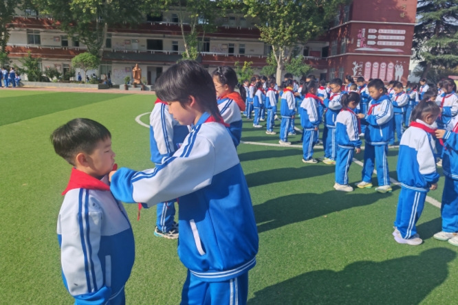 五年级老队员为新队员佩戴上红领巾,随后彼此庄重地互敬队礼。这一刻,不仅象征着荣耀的传递,也蕴含着深深的祝福,寄托着殷殷嘱托,更承载着无限的期望。